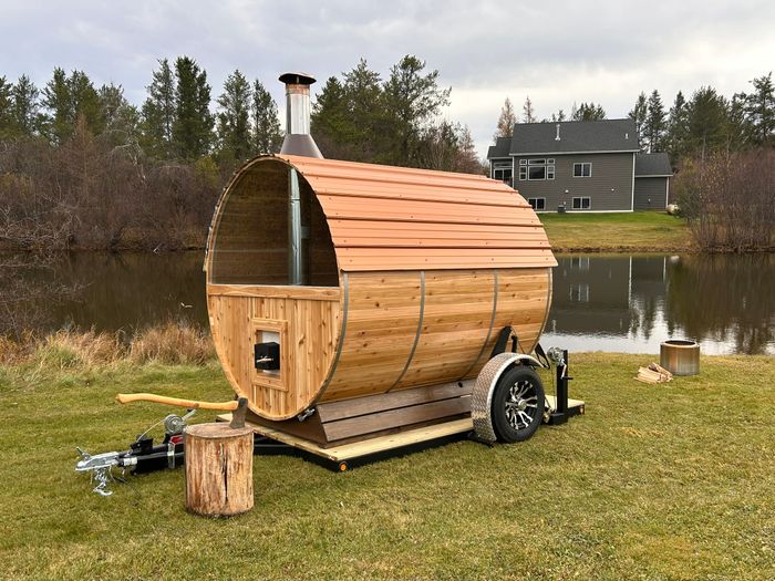 A mobile barrel sauna delivered right to you — handcrafted in Grand Rapids Minnesota and ready for your next adventure.